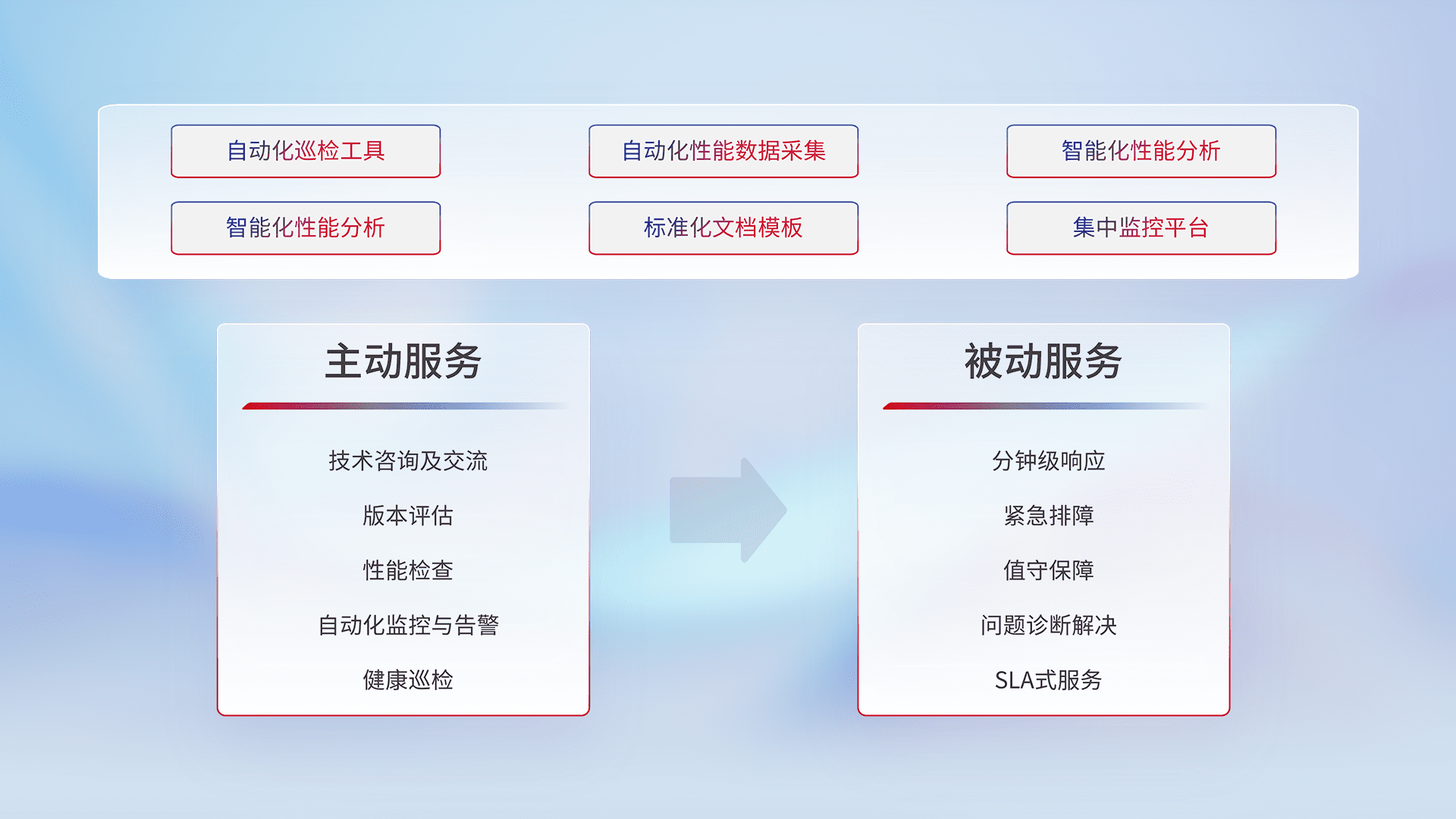 智能化工具和标准化文档,,,保障服务质量,,,,提供主动服务(包含技术咨询、、、版本评估、、、、性能检查、、自动化监控与告警、、、、健康巡检)和被动服务包含(分钟级响应、、、、紧急排障、、值守保障、、问题诊断解决、、、、SLA服务)。。。