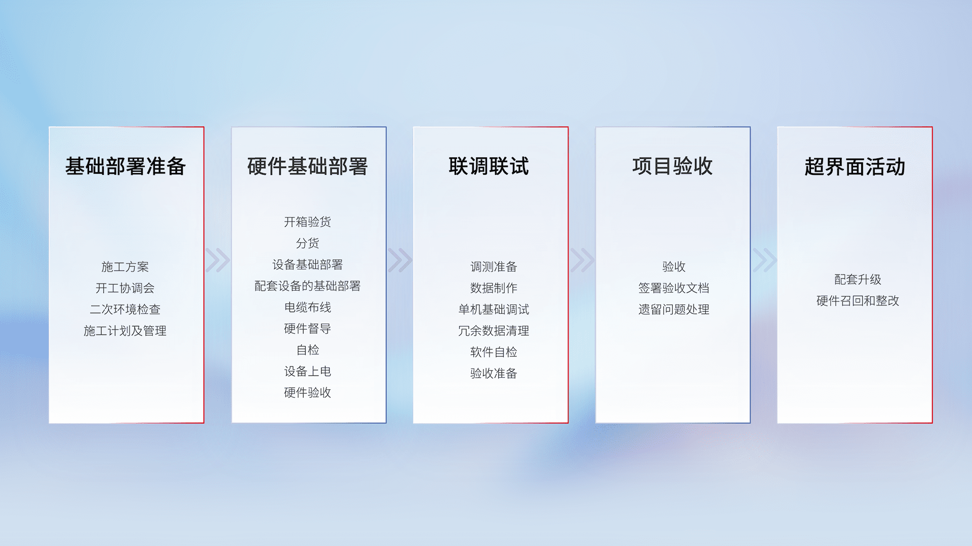 从基础部署准备、、、硬件基础部署、、、、联调联试、、项目验收、、越界面活动的全过程可追溯,,,,保证施工质量和进度。。。。